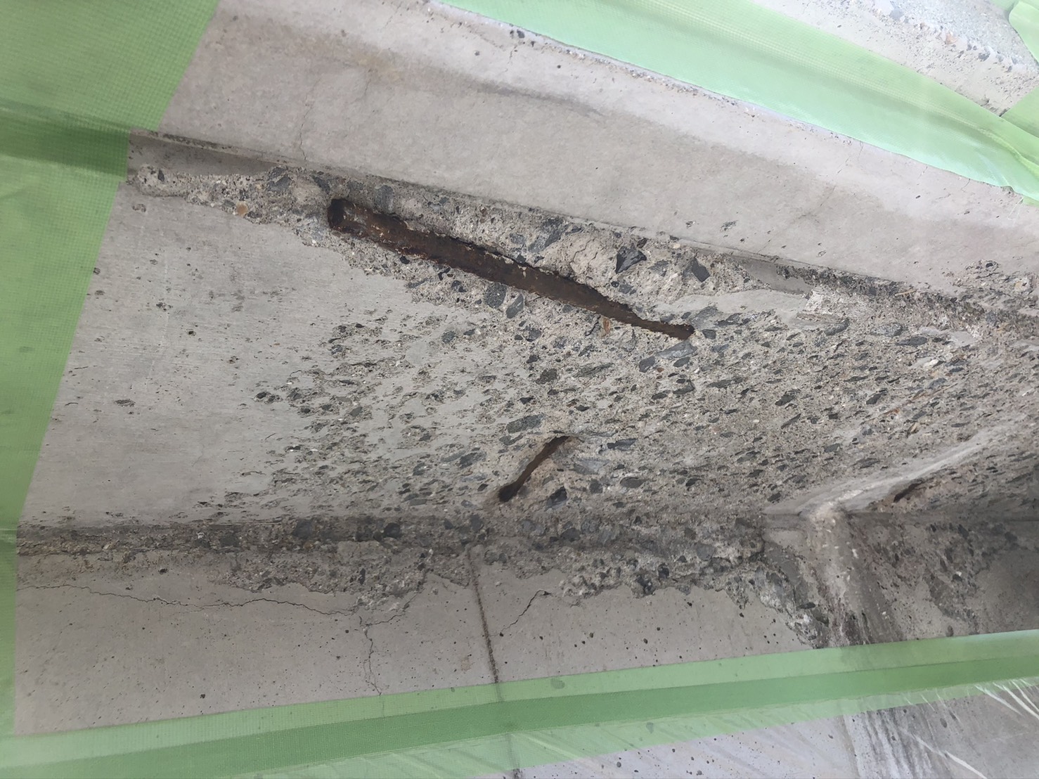 コンクリート劣化でひび割れなどから水が浸透して、内部の鉄筋が錆びて膨張して破断して、コンクリート片が落下などといった危険な状態です。