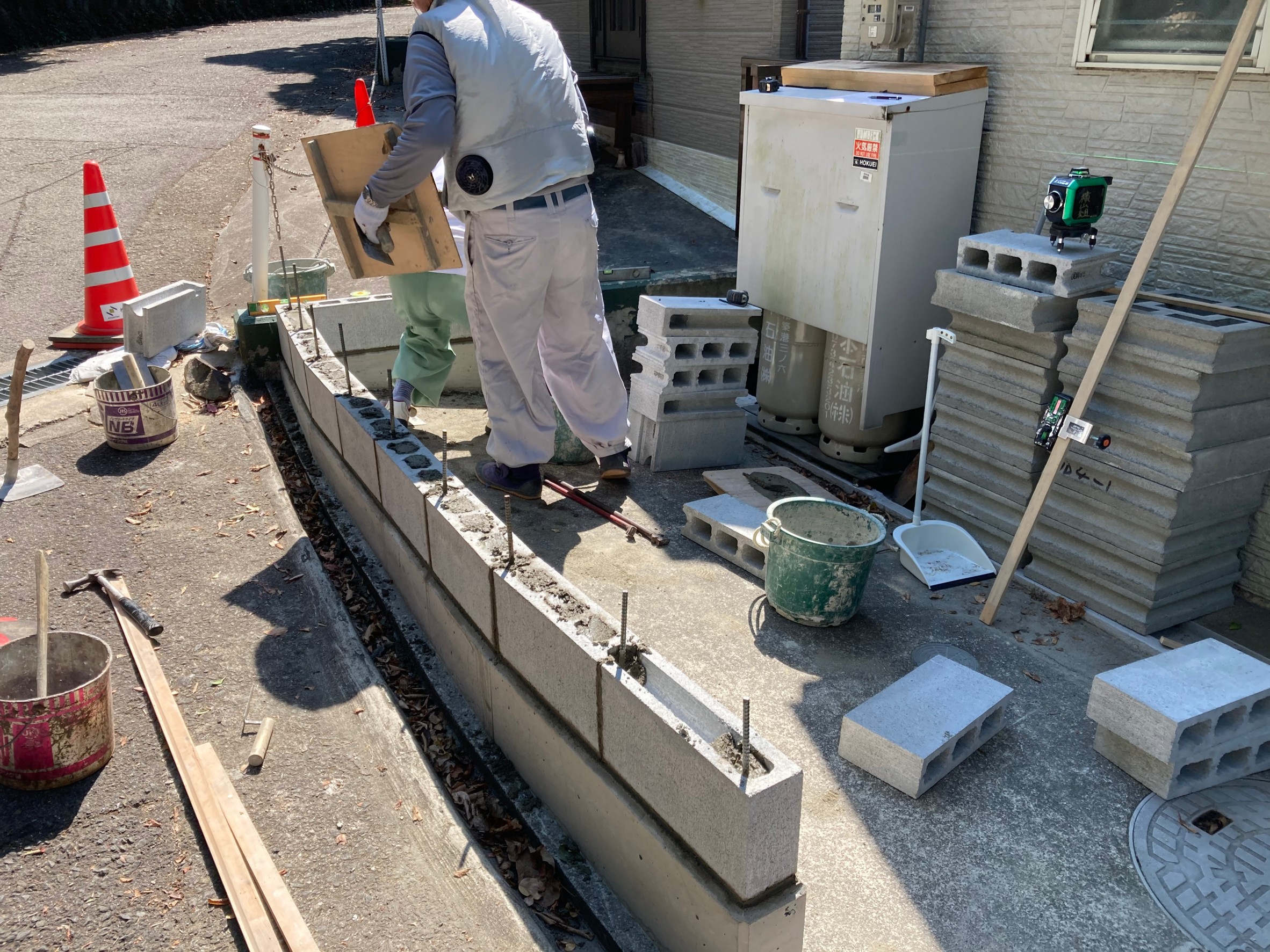 はじめて施工するブロックなので最初は並べて、眺めてブロックの目地幅を調整しました。配置は事前に決めてもらっていたので、その通りに積むだけなのでいつも通りに作業できました。