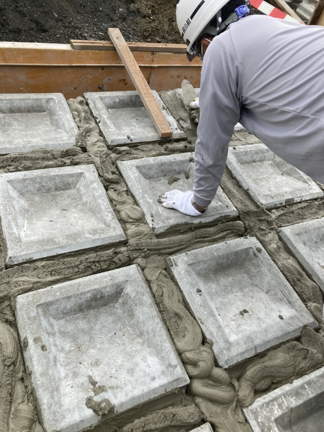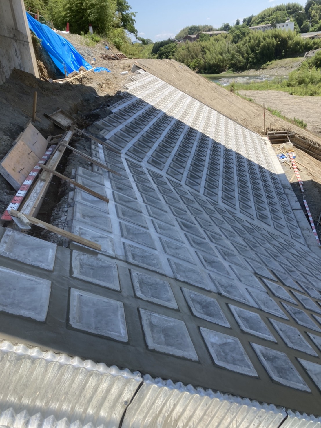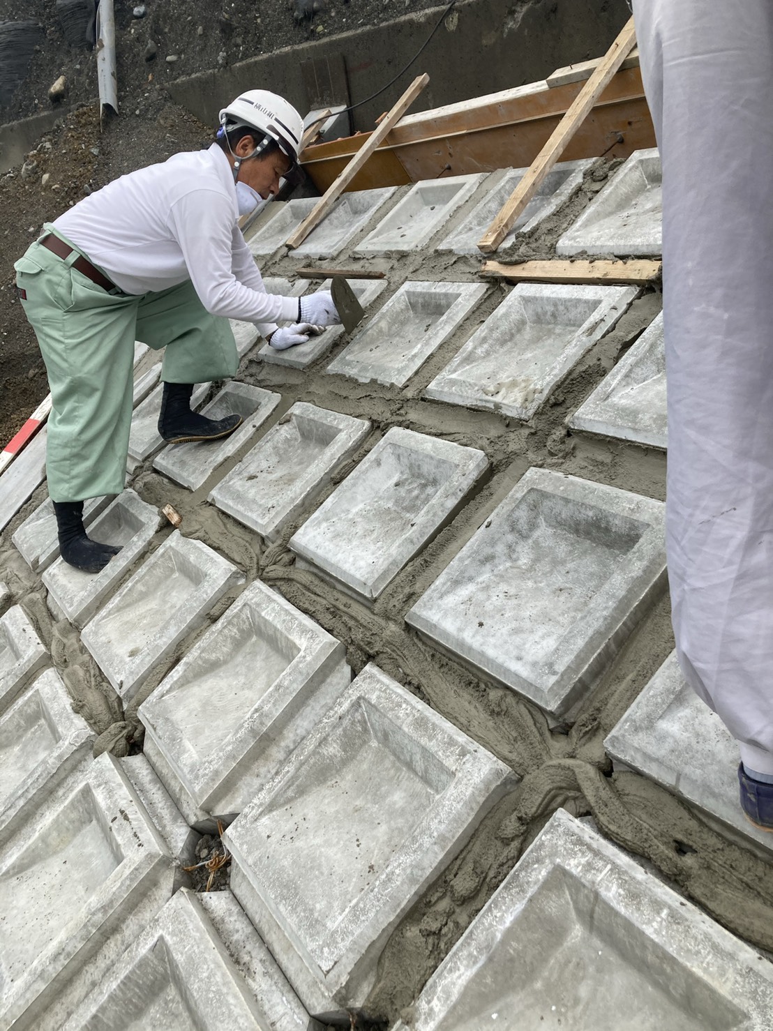 【モルタル塗り】河川敷きの斜面のブロックの間のモルタル塗り