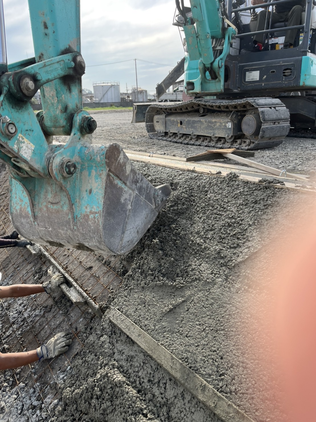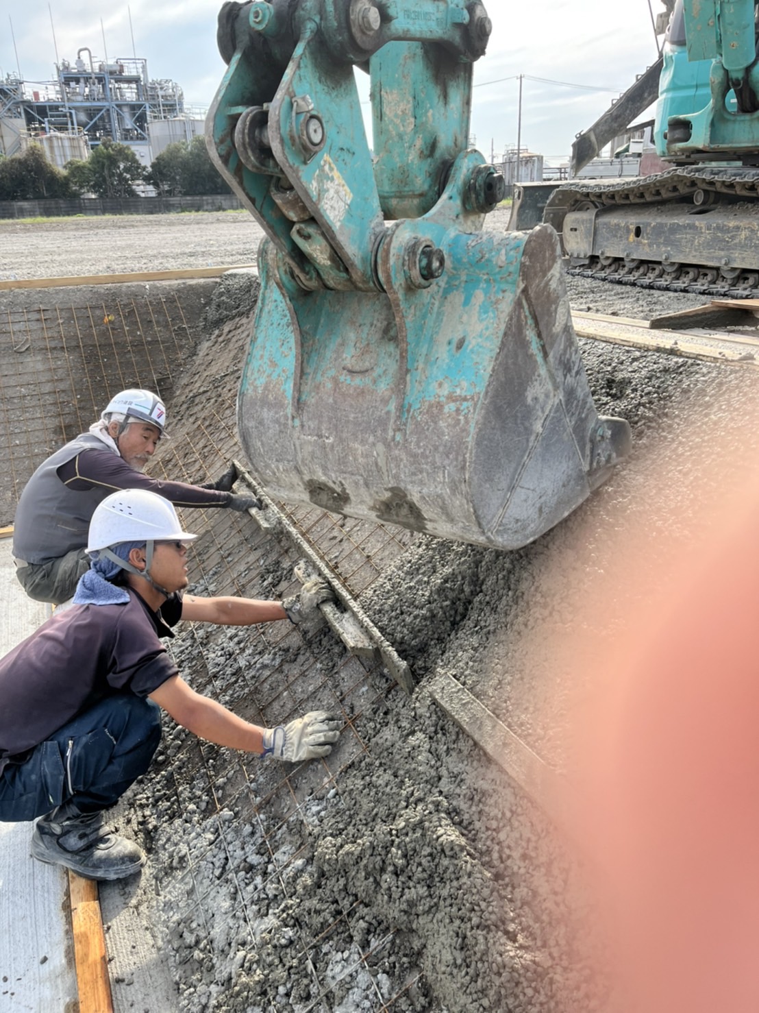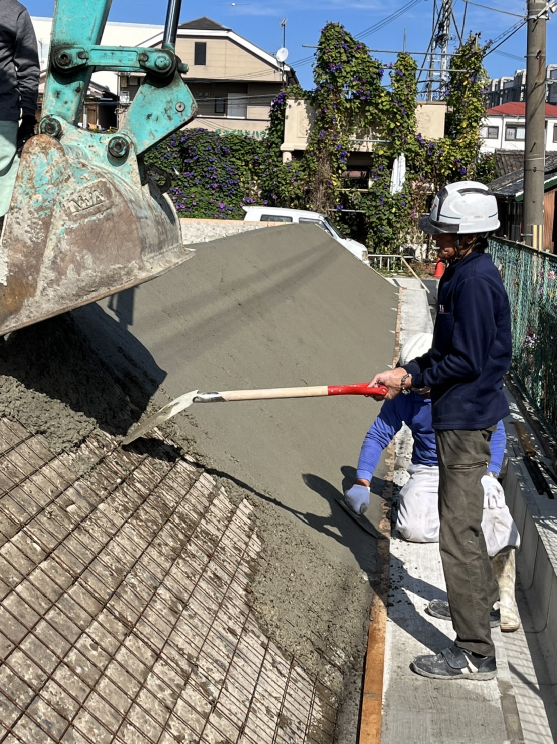 コンクリートは流れ落ちていかないように、板を受けてユンボでゆっくりまいていきます。