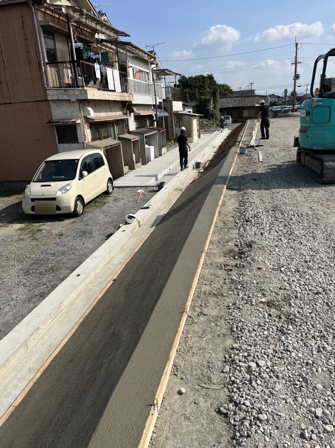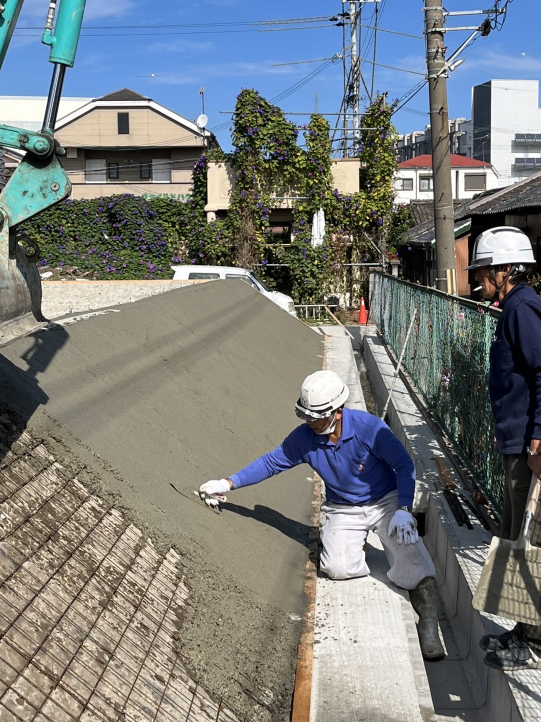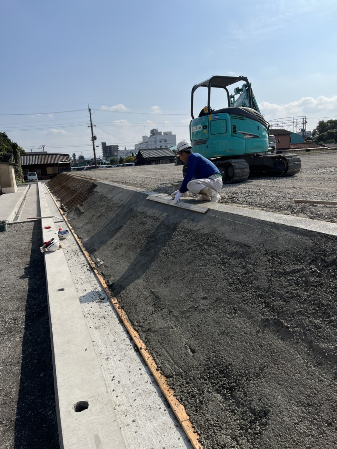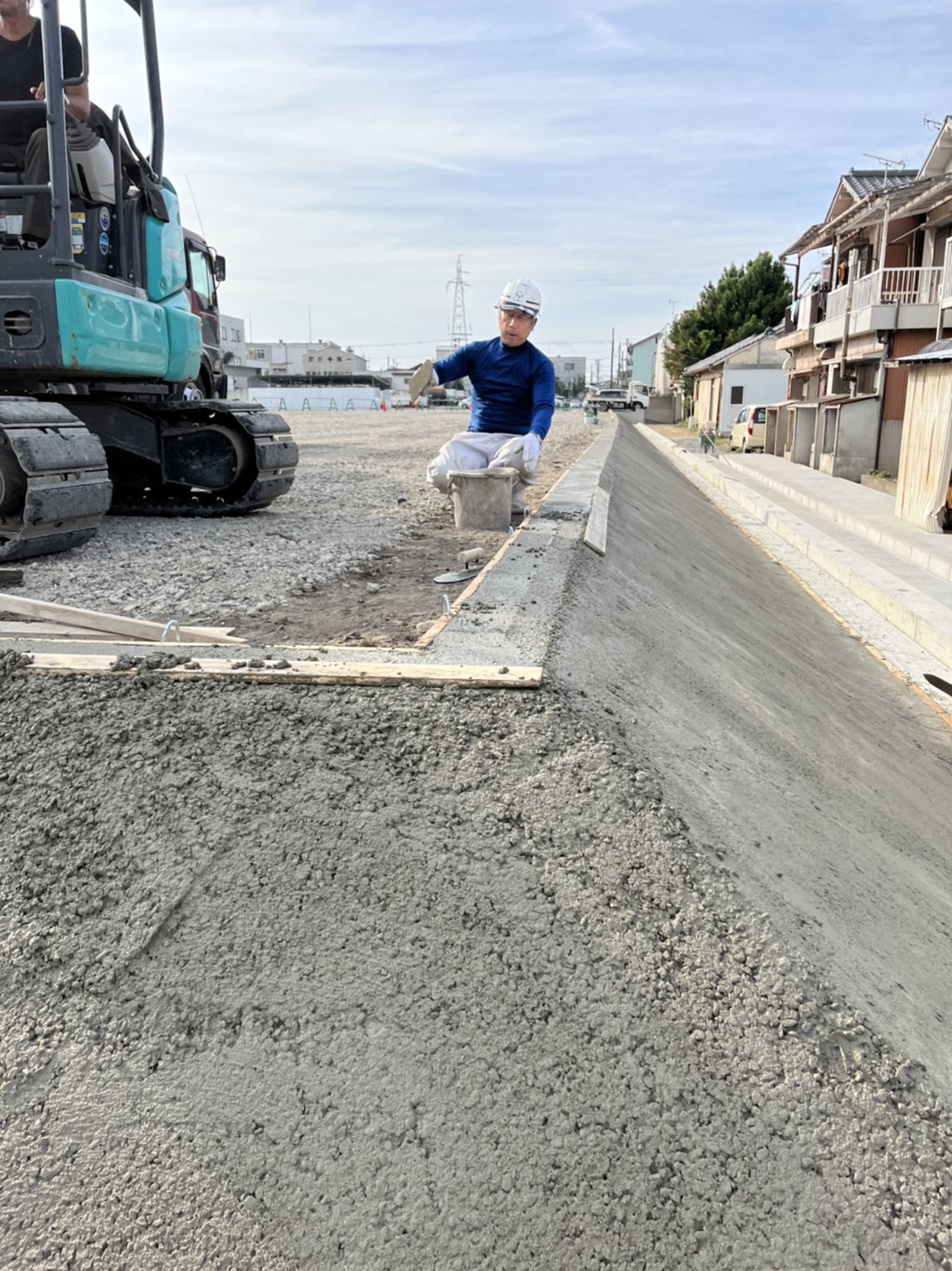 コンクリートは流れ落ちていかないように、板を受けてユンボでゆっくりまいていきます。