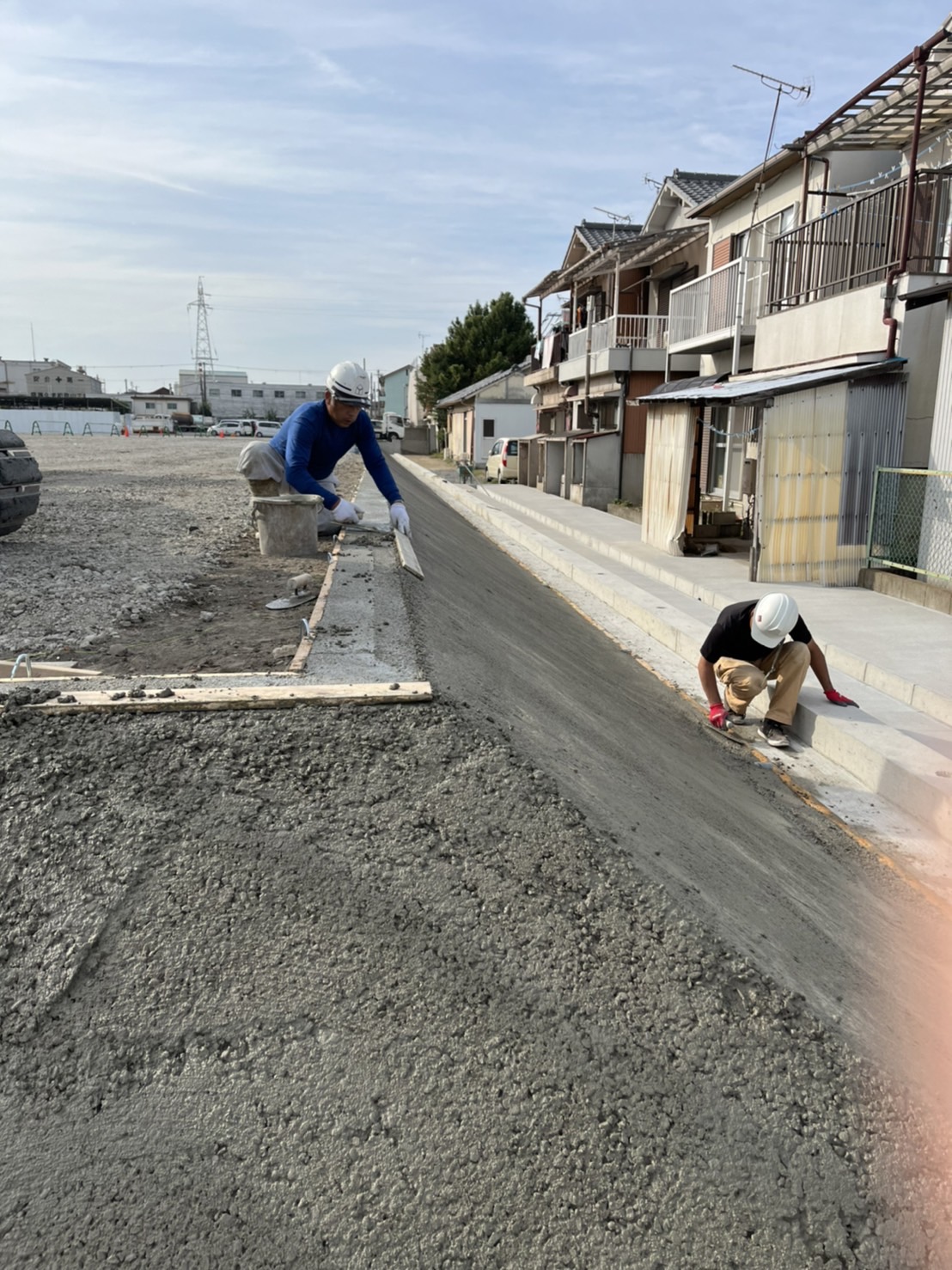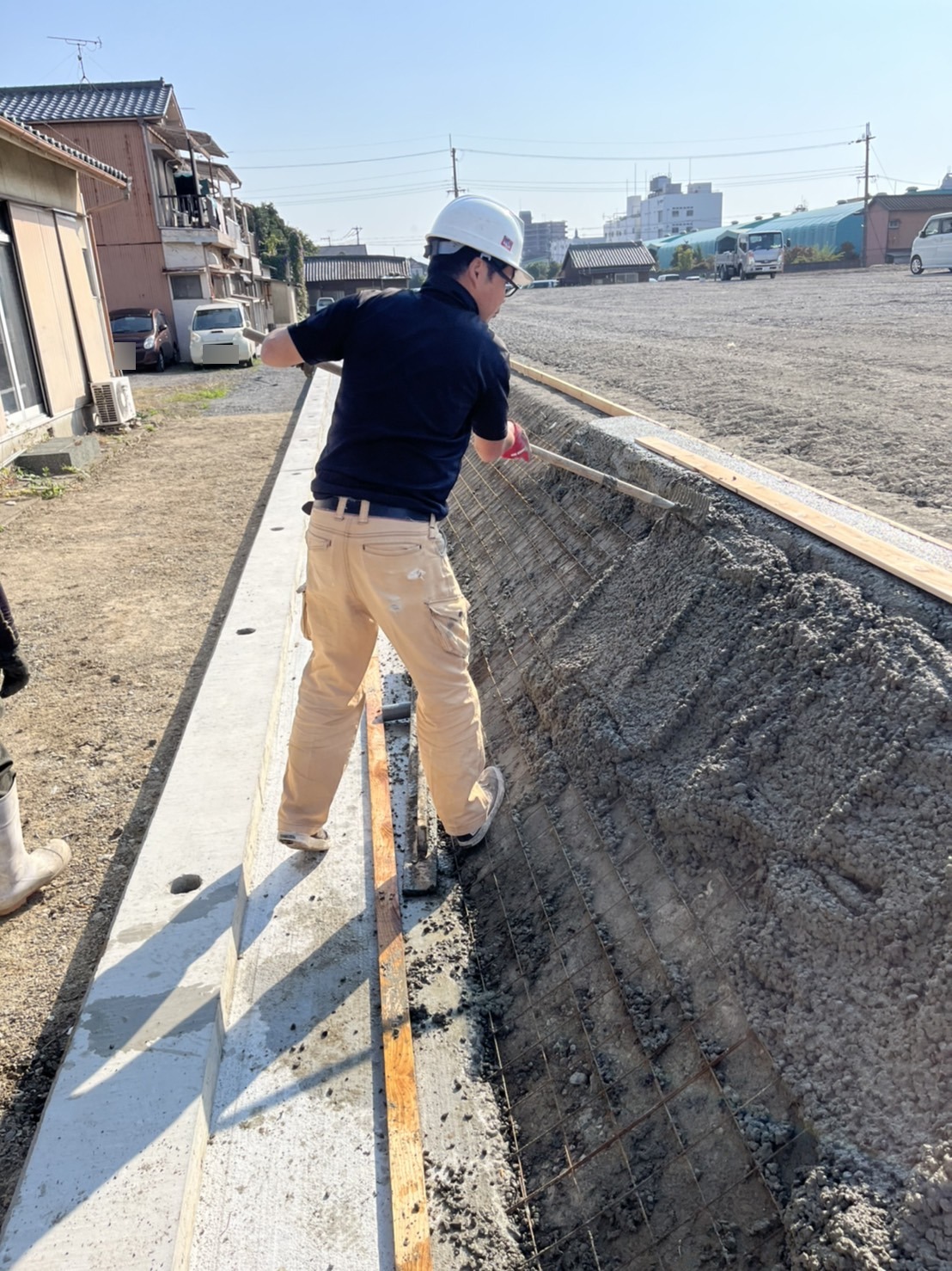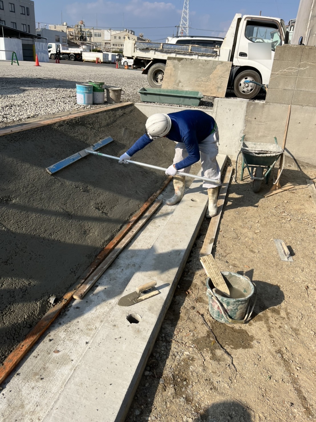 その後スクリード(アルミの板)で均していくのですが、この工程がなかなかうまくいかず苦労しました。