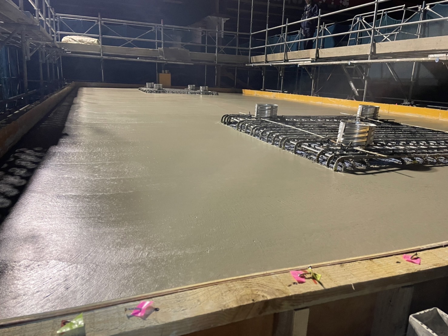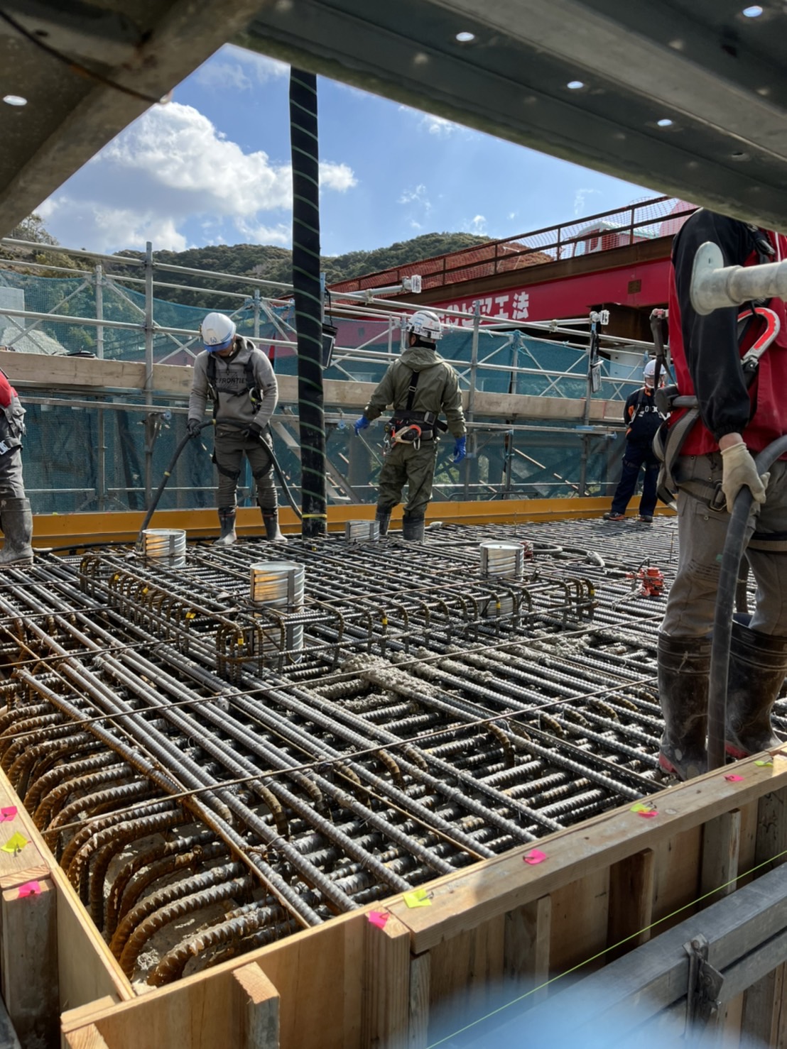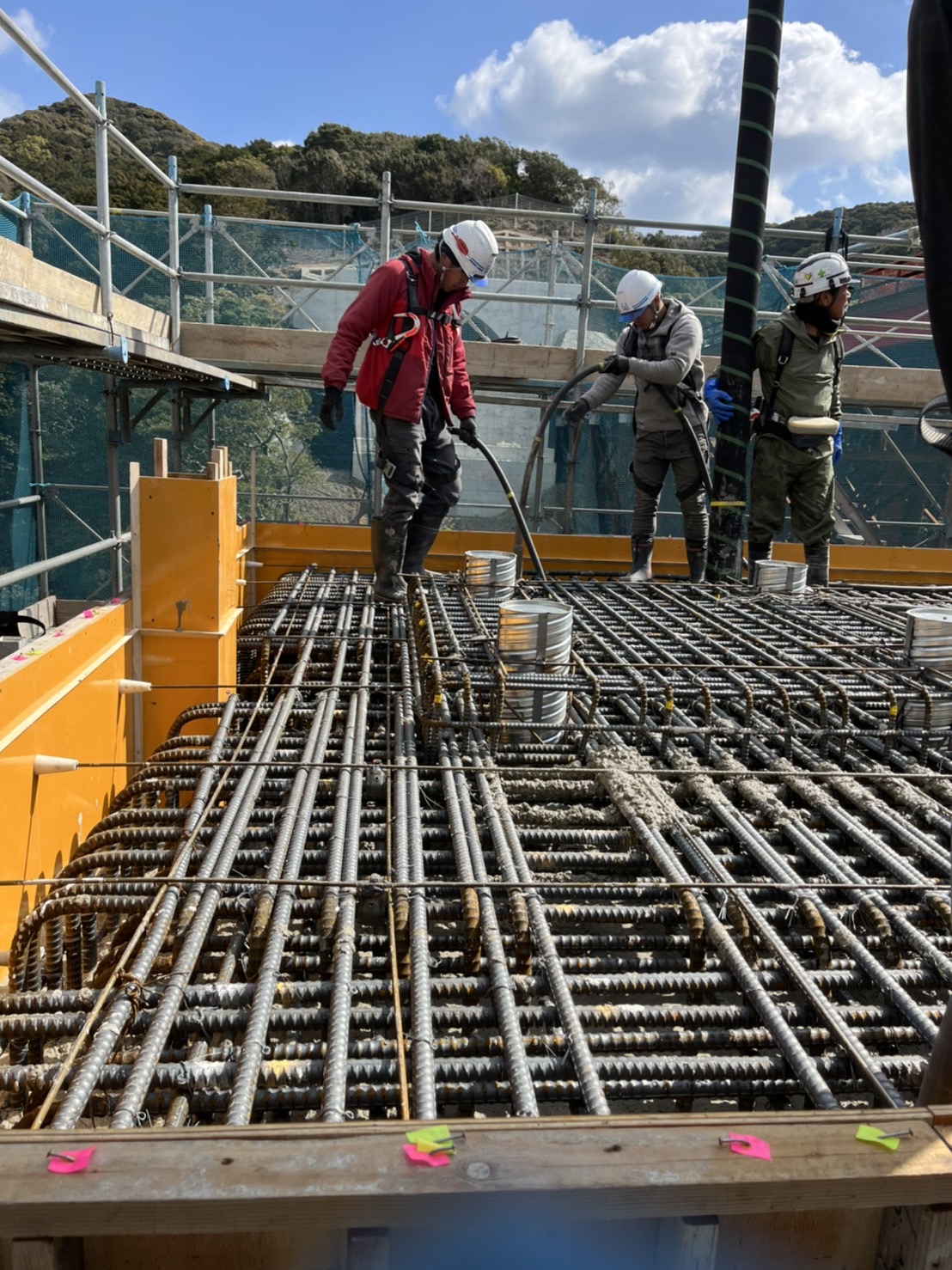 型枠に細かくバイブレーターを入れる箇所に目印を付けて打設していきます。