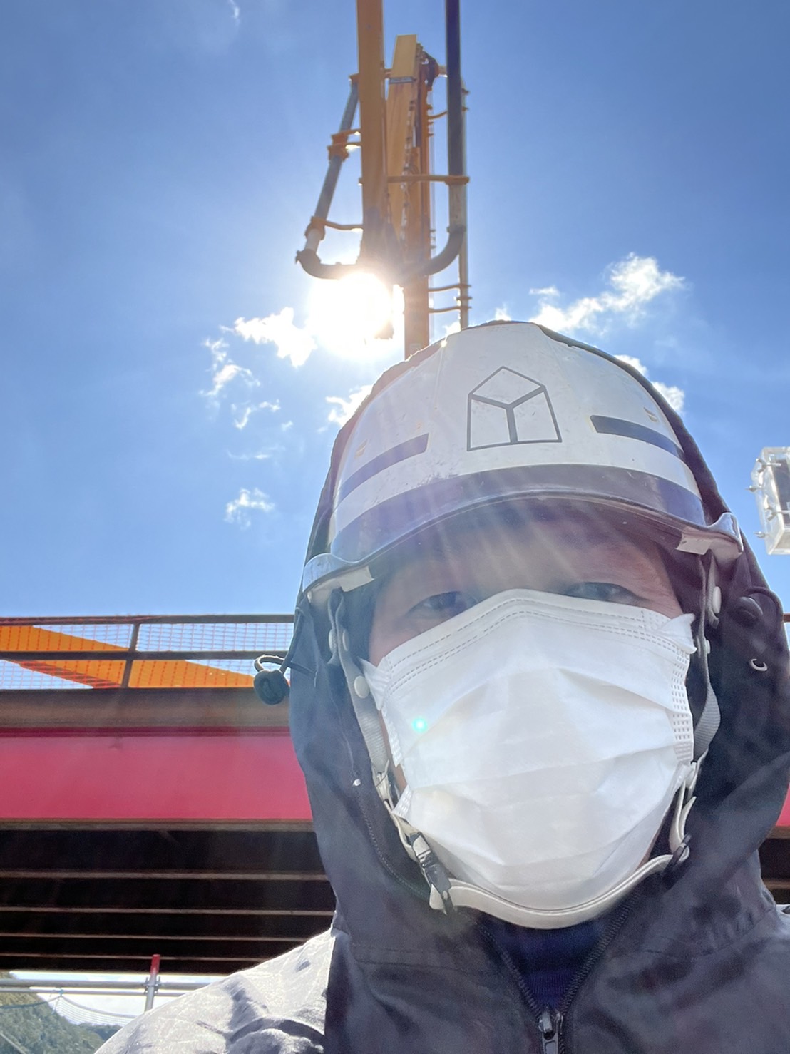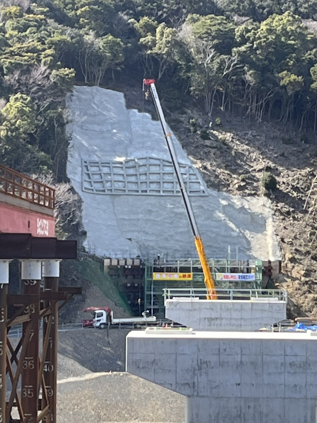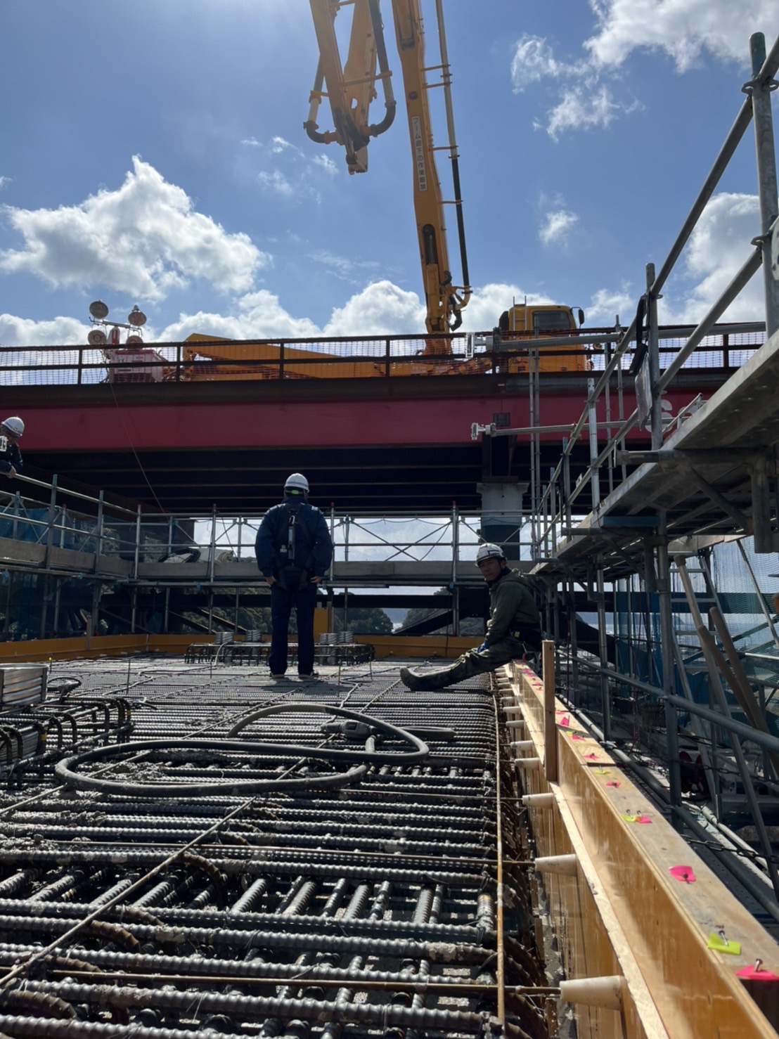 最上部の道路を支える通称ウイングのコンクリート部分の天端を、50平米のコンクリートで押さえています。