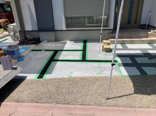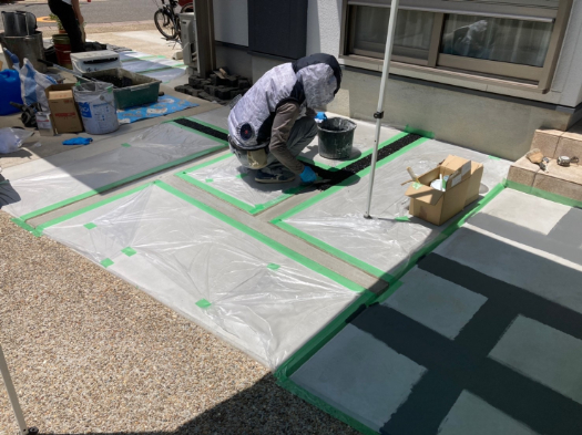 仕上がったモルタルの土間を汚さないようテープで養生します。