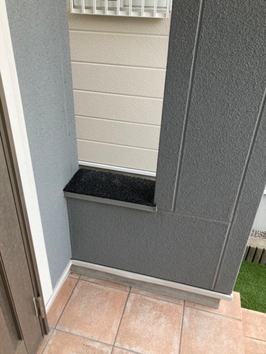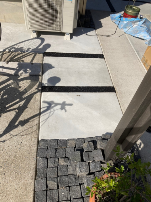 材料があまったので捨てるつもりで、勝手口の階段の踏面やスリットの天端、クーラーの室外機の周りに均しました。