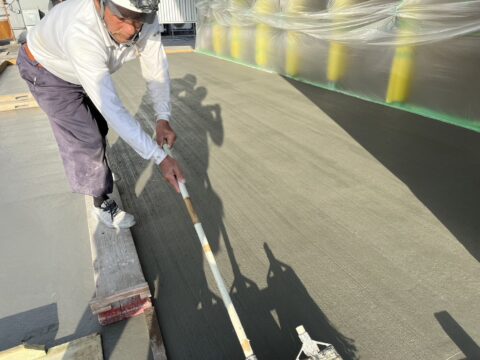 ミキサー車が一台なら問題ないのですが、何台か来る場合は一台目と二台目でコンクリートの固まるスピードが違うので、ほうきをはくタイミングがかわるからです。
