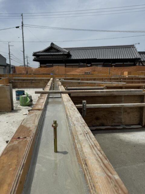 前日は雨でしたがコンクリート打設、アンカーボルト、天端ビスは基礎屋さんがセットしてくれました。