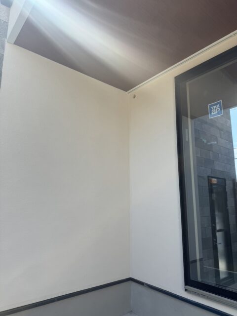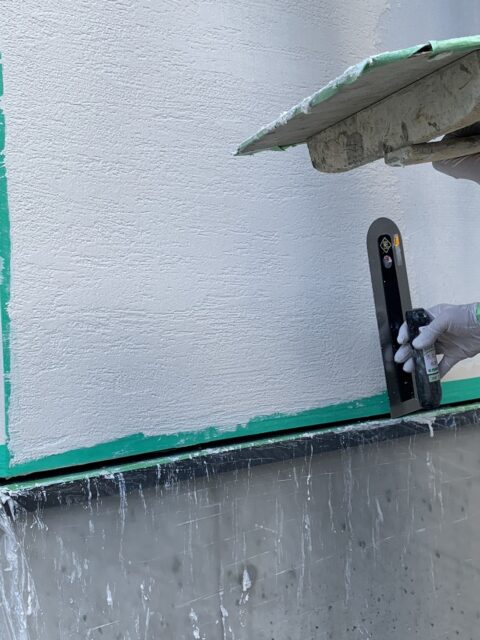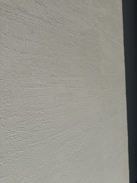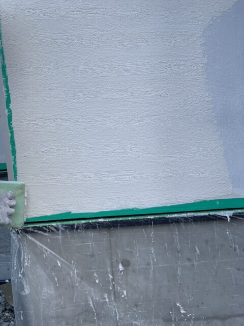 下地が出ないように全面に塗り付けていき、次の日に仕上げ塗りなんですが、壁が大きいので、出隅と入隅はテープを貼って縁取りしました(。)