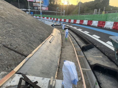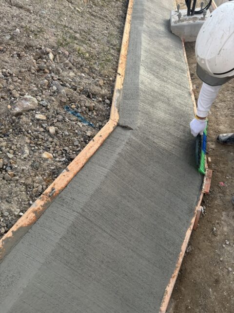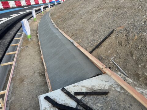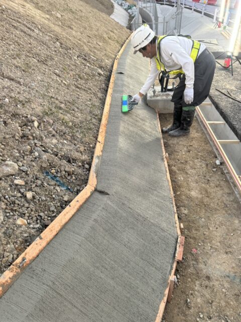 今回は土木工事で斜面の裾をコンクリートで均してホウキ目で仕上げ作業を施工しました。