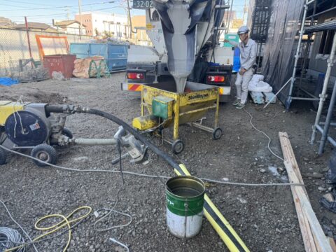 斜面の上側の駐車場に生コン車とレッカーを止めて、バッカンに生コンクリートを入れてレッカーで吊って作業場まで運んでバッカンの下から生コンを出しながら高さまで均していく作業です。
