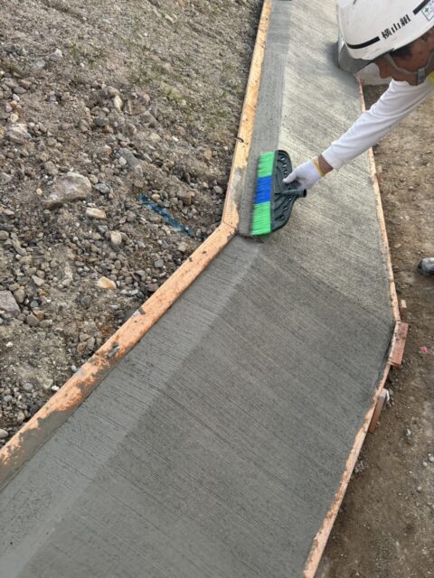 斜面の裾をコンクリートで均してホウキ目で仕上げ作業を施工しました