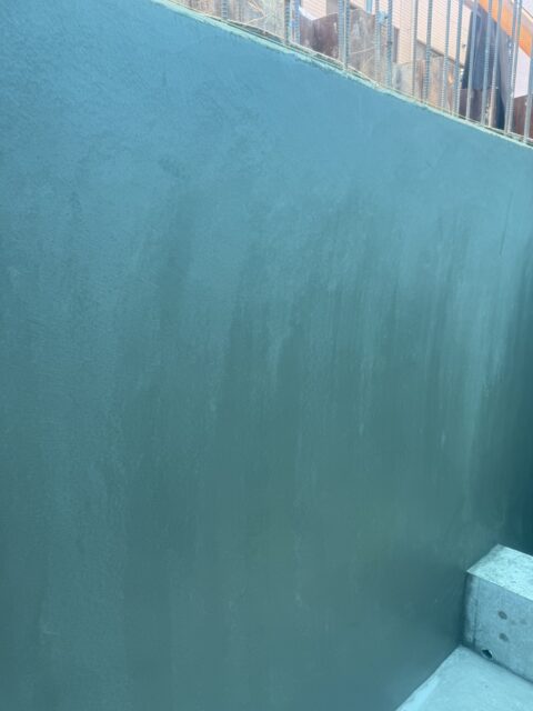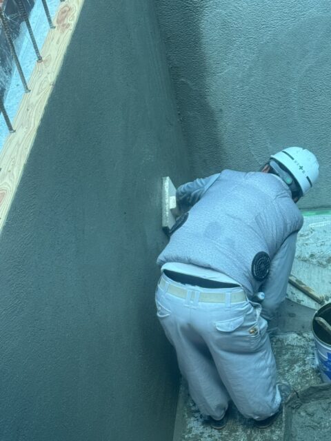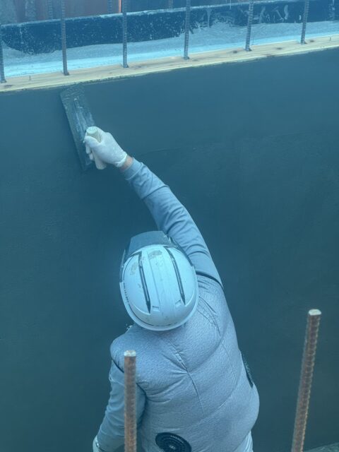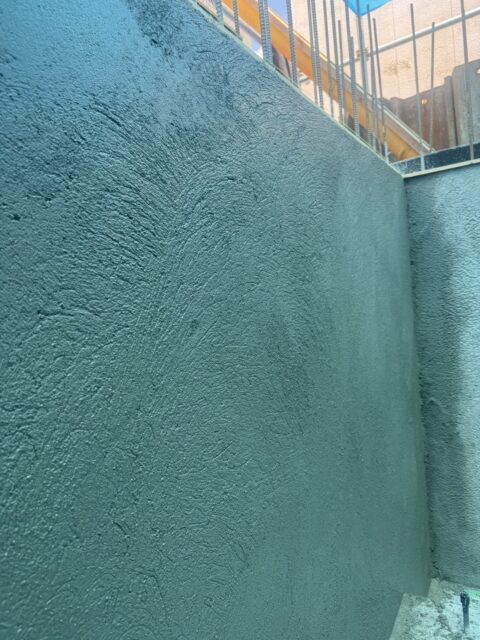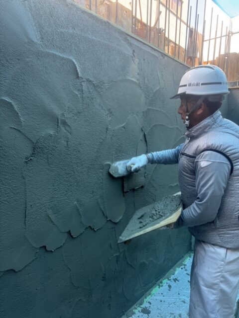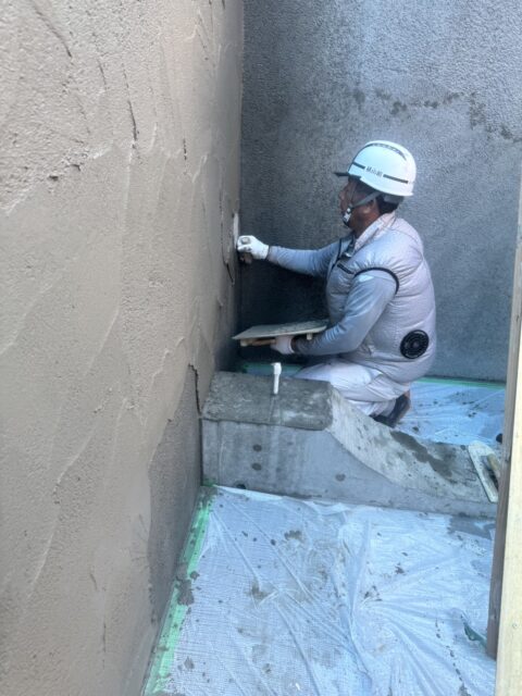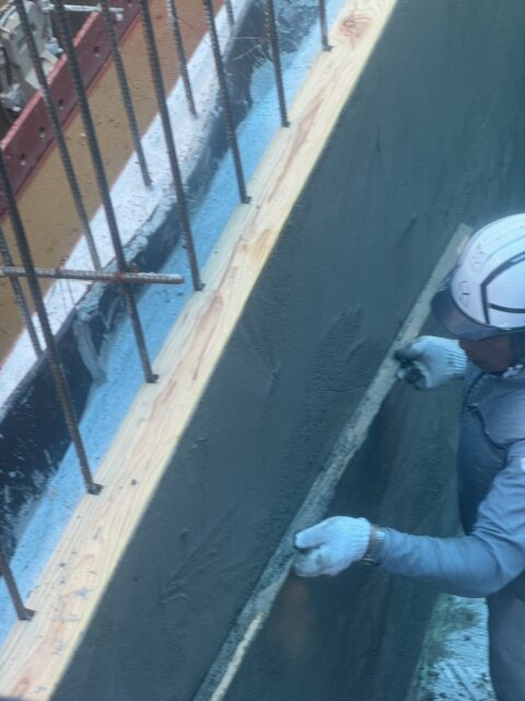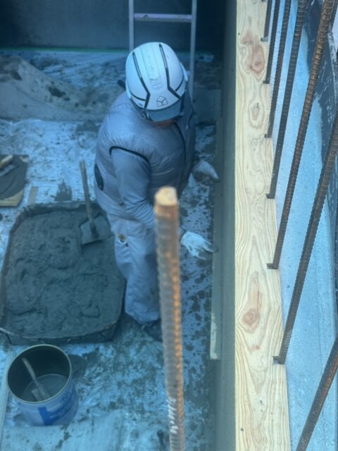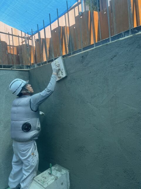 まず先行でコンクリートの土間や壁のコンクリートを打設し、型枠を脱型し、コンクリートを乾燥させた後に左官でモルタル仕上げをおこないました。