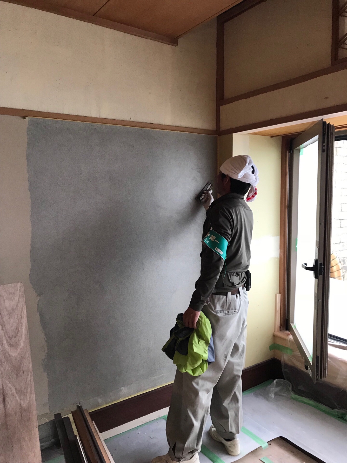 台風21号の強風で剥がれた漆喰壁の塗り替え工事。被災された方、心からお見舞い申し上げます。